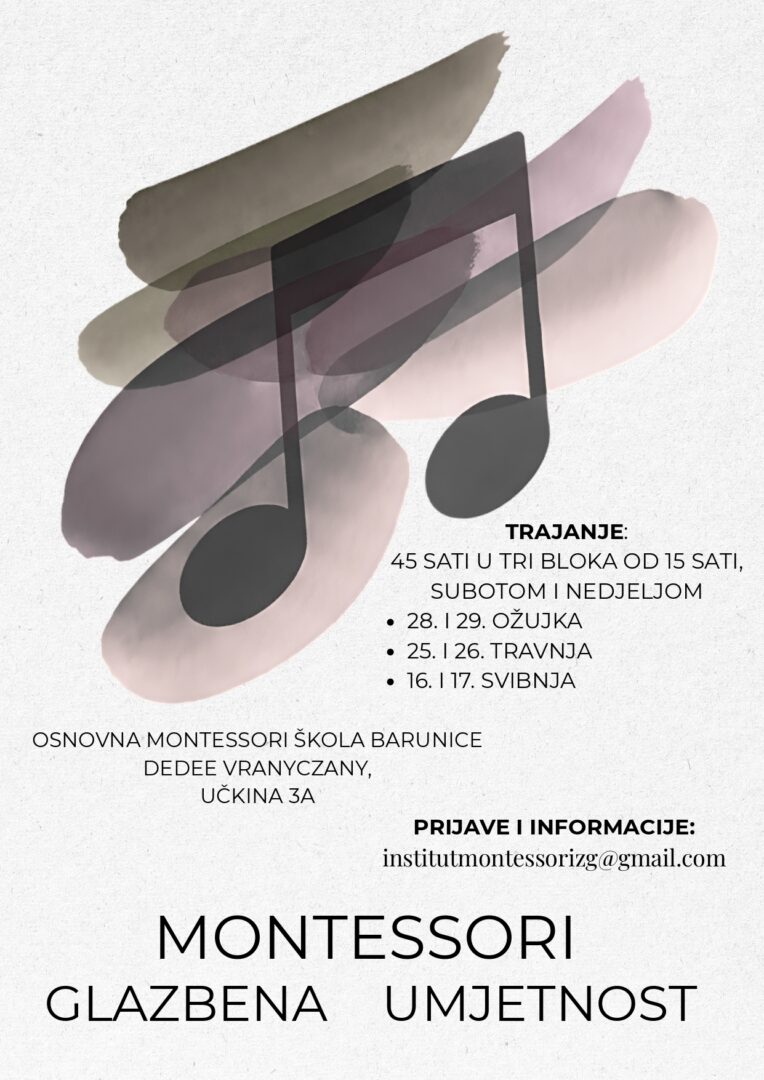 Pozivamo sve polaznike koji su završili stručno usavršavanje iz Montessori pedagogije (3.–12. godina) da se uključe u edukaciju Montessori glazbena umjetnost.